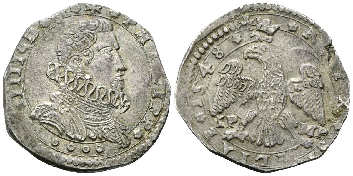 Dr. +★PHILIPP★ - ★ III★ D★G★. Busto Busto corazzato, coronato, con colletto alla spagnola, a d.; sotto, quattro globetti. Rv. ★REX★ SICILIAE★ 1648★. Aquila coronata ad ali aperte, volta a s.; sotto le ali, IP - MP.