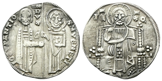 Dr. •IO•SVPANTIO• - S M VENETI•. San Marco e il Doge, stanti e frontali, reggono entrambi lo stendardo; lungo l’asta, sotto l’orifiamma, D/V/X. Rv. Il Redentore seduto in trono; sotto il gomito s., cerchietto; ai lati, IC - XC.