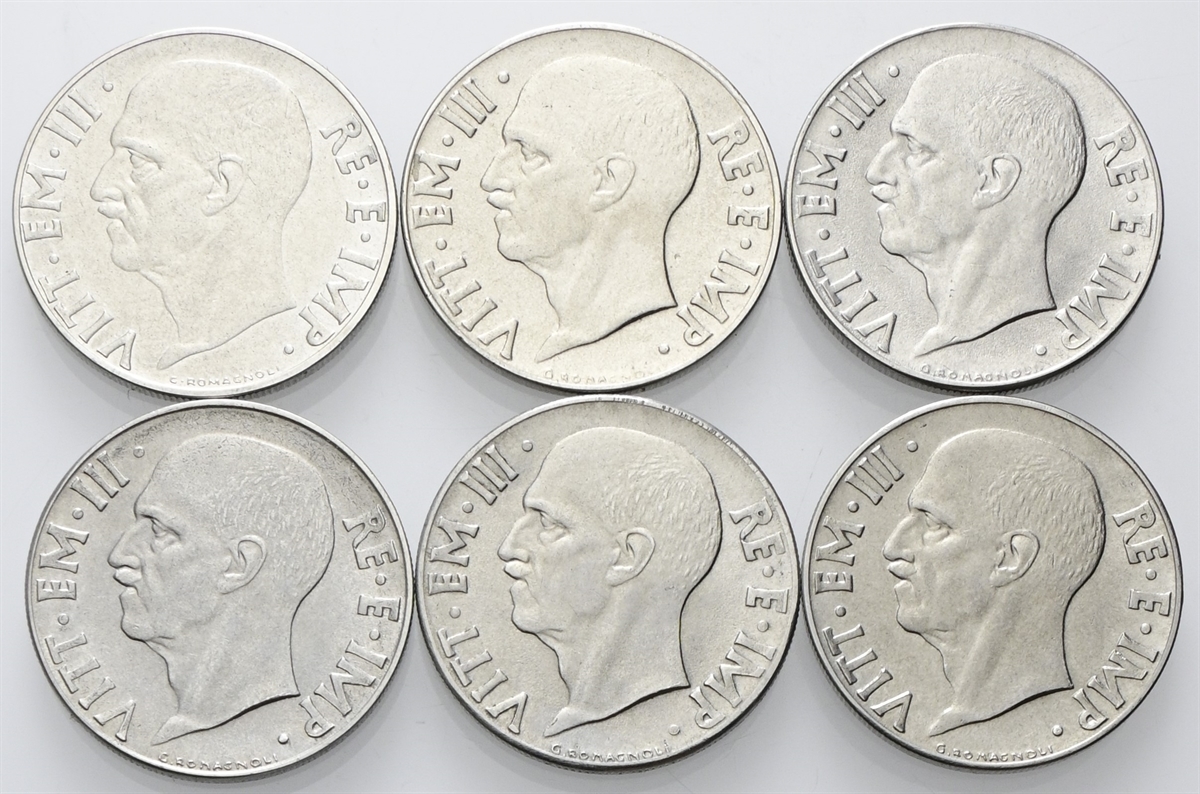 Vittorio Emanuele III, 1900-1943. Lotto di n. 6 esemplari da 20 Centesimi Impero datati 1939-1943.