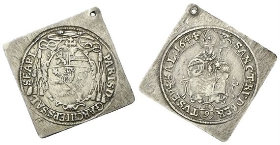 Dr. PARISD GRACHI ESP SAL - SE APL. Stemma con galero. Rv. SANCT RVDBER - TVS EPS SALISB 1644. San Ruperto, frontale, seduto su trono