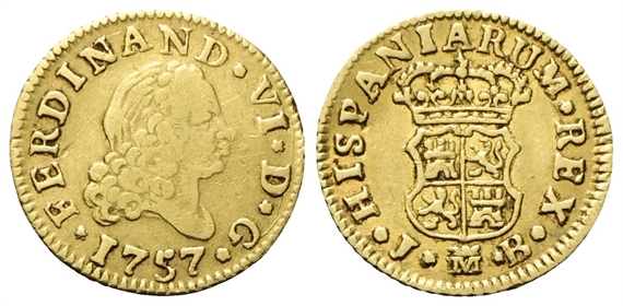 Dr. ✿FERDINAND ✿ VI ✿ D ✿ G✿ 1757. Busto del Re a d. Rv. ✿HISPANIARUM ✿ REX✿. Stemma coronato.