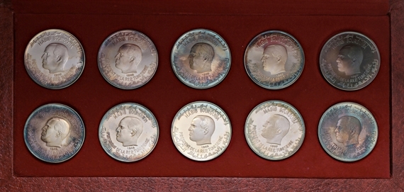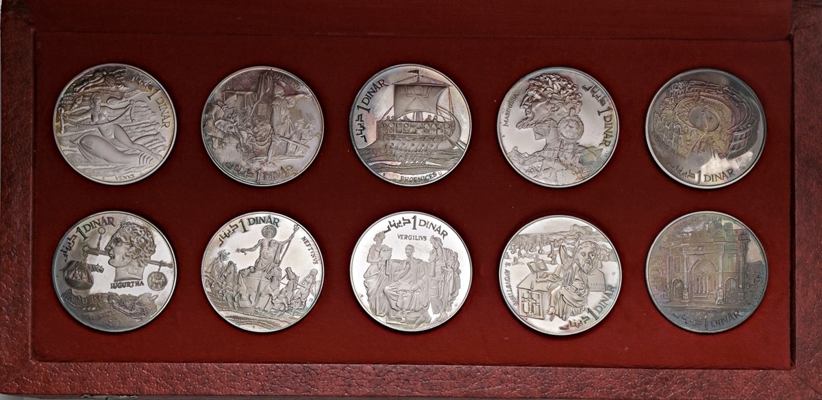 Habib Bourguiba, 1957-1987. Cofanetto contenante 10 monete da 1 dinar 1969.