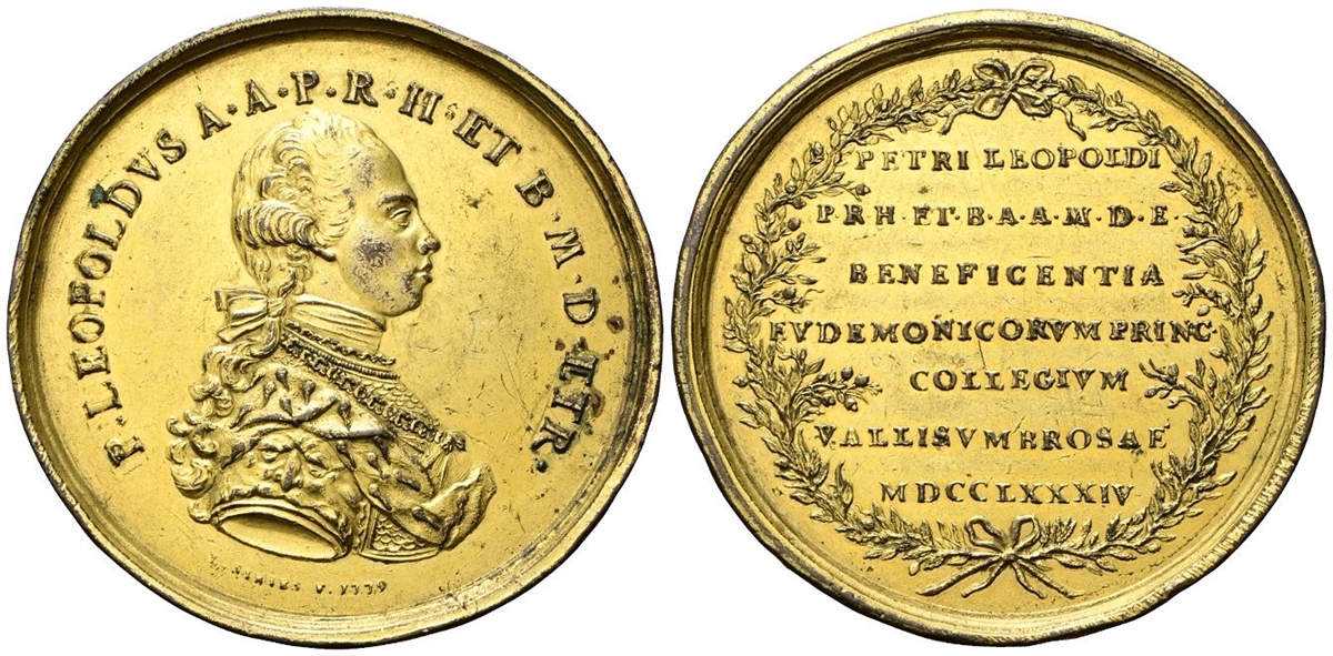 Dr. P LEOPOLDVS A A P R II ET B M D ETR. Busto corazzato a d.; sotto, L SIRIES F 1779. Rv. PETRI LEOPOLDI / P R H ET B A A M D E / BENEFICENTIA / FVDEMONICORVM PRINC / COLLEGIVM / VALLISVMBROSAE / MDCCLXXXIV. Iscrizione disposta su sette righe, tra due arbusti floreali.