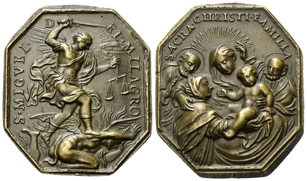 Dr. S MIGVEL - D - EL - MILAGR. L’Arcangelo Michele in costume da soldato romano, con la spada alzata nella d. e la bilancia dell'anima nella s., schiaccia il demone nelle fiamme dell'inferno. Rv. SACRA CHRISTI FAMILIA. La Sacra Famiglia con Sant’Anna e Gioacchino.