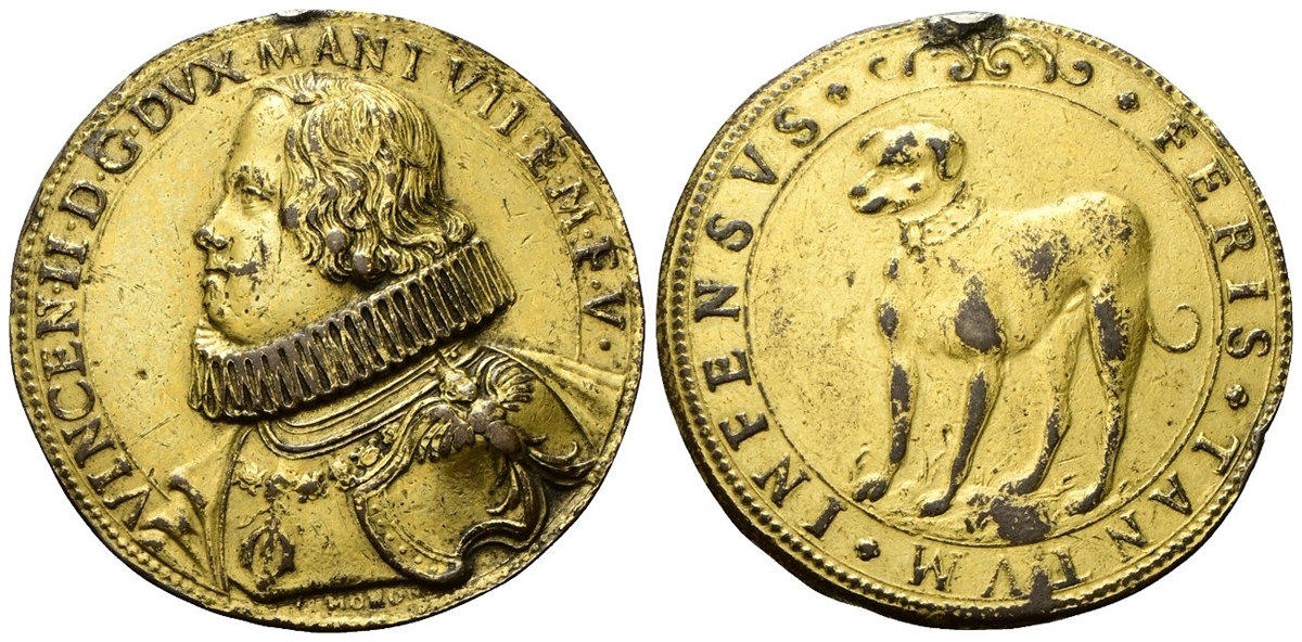 Dr. VINCEN II D G DVX MANT VII E M F V. Busto del Duca a s., con capo scoperto, con corazza e collare del Redentore; sotto il taglio del busto, G MORONE. Rv. FERIS TANTVM INFENSVS. Grande cane con collare volto a s. su terreno erboso entro un cerchio di perline.