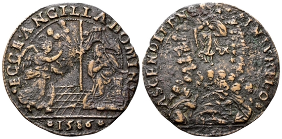Dr. ECCE ANCILLA DOMINI. Rappresentazione dell’Annunciazione: l’Angelo con giglio in mano e la colomba dello Spirito Santo appaiono a Maria; in esergo, 1586. Rv. ASCENDIT D N S IN IVBILO. Ascesa di Cristo dinanzi ai discepoli.