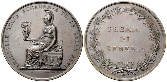 Dr. IMPERIALE REGIA ACCADEMIA DELLE BELLE ARTI. Atene seduta verso s. regge con la mano s. le Tre Grazie; in esergo, L MANFREDINI F. Rv. PREMIO / DI / VENEZIA. Iscrizione disposta su tre righe tra rami di lauro.