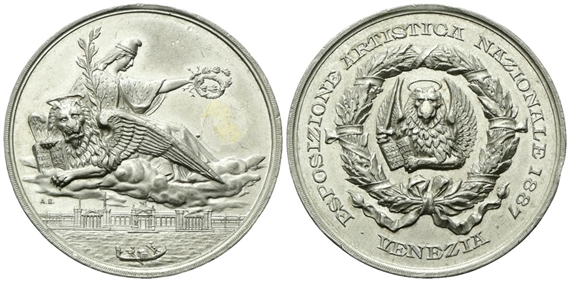 Dr. Venezia seduta verso d., con corno dogale regge ramo di alloro e corona; a s., il Leone di San Marco; sullo sfondo, veduta del centro espositivo. Rv. ESPOSIZIONE ARTISTICA NAZIONALE 1887. Leone di San Marco frontale entro corona di foglie di alloro; sotto, VENEZIA.