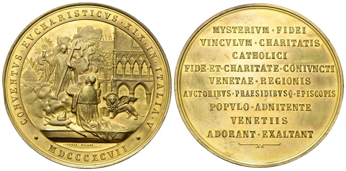 Dr. CONVENTVS EVCARISTICVS XIX IN ITALIA V HABITVS VENETIIS AN MDCCCXCVII. Il doge genuflesso davanti a una Santa che reca Crocefisso e Calice con ostia raggiante; ai lati, corno dogale su cuscino e Leone di San Marco; sullo sfondo, angolo di Palazzo Duc Rv. MYSTERIVM FIDEI / VINCVLVM CHARITATIS / CATHOLICI / FIDE ET CHARITATE CONIVNCTI / VENETAE REGIONIS / AVCTORIBVS PRAESIDIBVSQ EPISCOPIS / POPVLO ADNITENTE / VENETIIS / ADORANT EXALTANT. Iscrizione disposta su nove righe.
