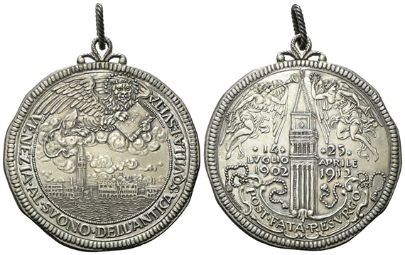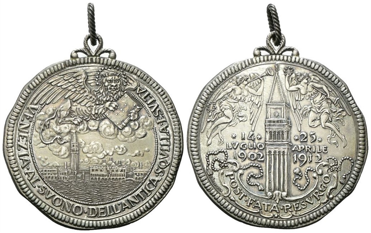 Dr. VENEZIA AL SVONO DELL’ANTICA SQVILLA ESVLTA. Leone di San Marco in volo verso d. sul Canal Grande; sullo sfondo, Piazza S. Marco col campanile. Rv. Due figure alate, una suona la tromba, l’altra regge serto d’alloro, ai lati del Campanile ricostruito; ai lati, 14 / LVGLIO / 1902 - 25 / APRILE / 1912; sotto, POST FATA RESVRGO (entro cartiglio).