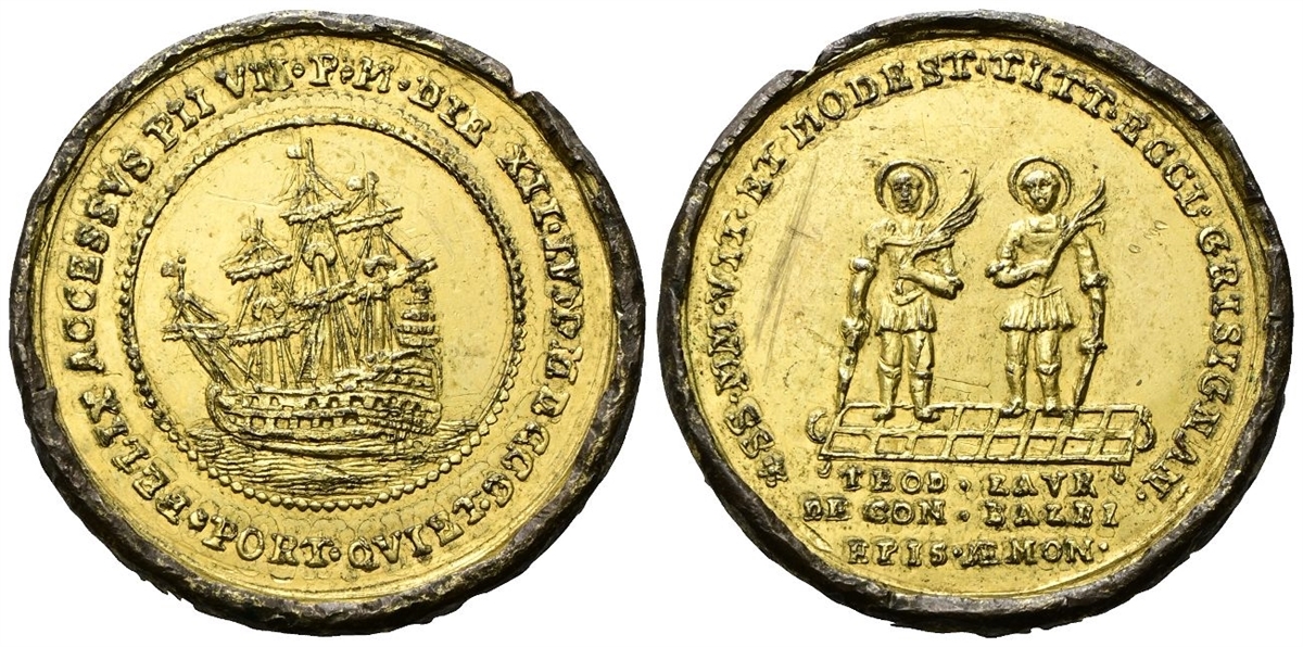 Dr. FELIX ACCESSVS PII VII P M DIE XII IVN 1800 - PORT QVIET.L a nave Bellona recante sul cassero la tiara pontificia. Rv. SS MM VIT ET MODEST TITT ECCL GRISIGNAN. Santi Vito e Modesto, nimbati, con armatura e spada, reggenti la palma del martirio, ritti sulla graticola; in esergo, THEOD LAVR / DE CON BALBI / EPIS AEMON.