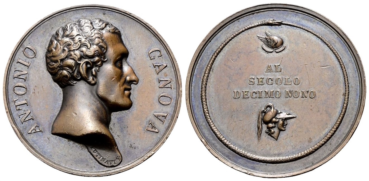 Dr. ANTONIO - CANOVA. Testa a d.; sotto il taglio del collo, PUTINATI F. Rv. AL / SECOLO / DECIMO NONO. Iscrizione disposta su tre righe; sopra, petaso; sotto, testa di Minerva.