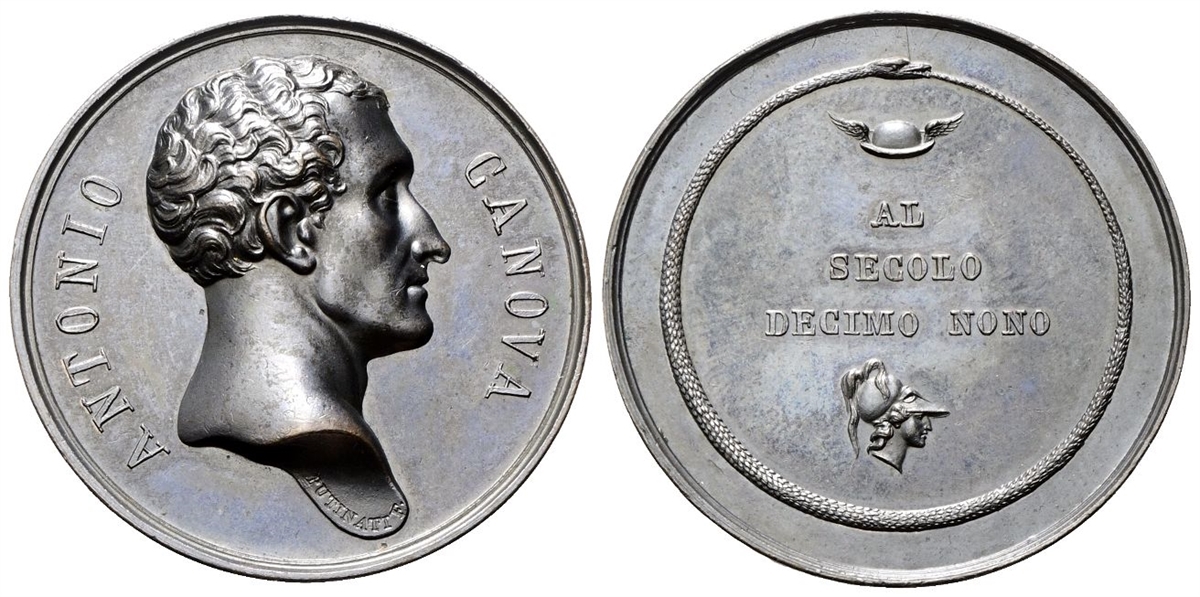Dr. ANTONIO - CANOVA. Testa a d.; sotto il taglio del collo, PUTINATI F. Rv. AL / SECOLO / DECIMO NONO. Iscrizione disposta su tre righe; sopra, petaso; sotto, testa di Minerva.