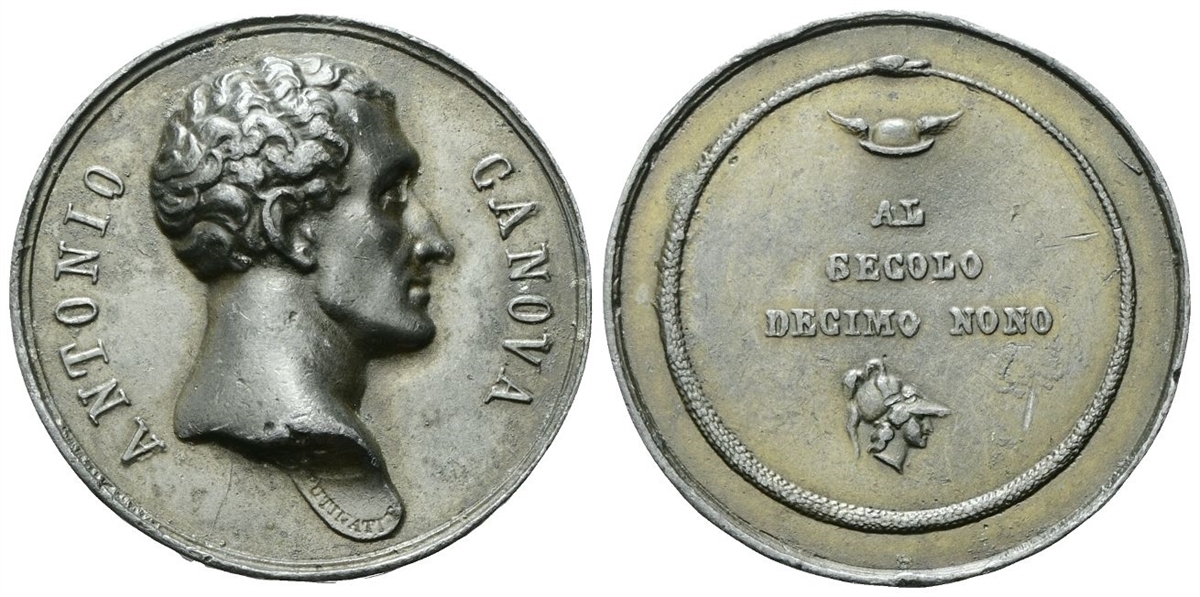 Dr. ANTONIO - CANOVA. Testa a d.; sotto il taglio del collo, PUTINATI F. Rv. AL / SECOLO / DECIMO NONO. Iscrizione disposta su tre righe; sopra, petaso; sotto, testa di Minerva.
