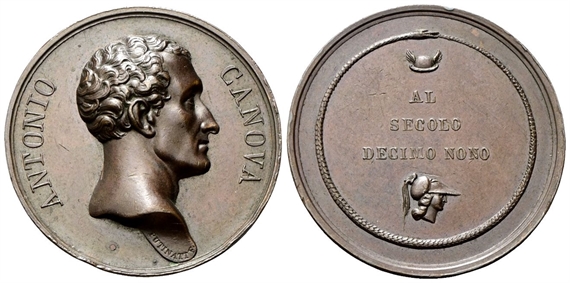Dr. ANTONIO - CANOVA. Testa a d.; sotto il taglio del collo, PUTINATI F. Rv. AL / SECOLO / DECIMO NONO. Iscrizione disposta su tre righe; sopra, petaso; sotto, testa di Minerva.