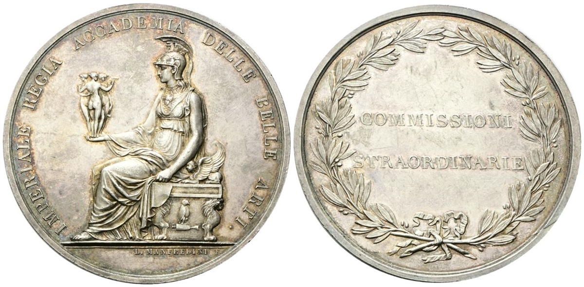 Dr. IMPERIALE REGIA ACCADEMIA DELLE BELLE ARTI. Atene seduta verso s. regge con la mano s. le Tre Grazie; in esergo, L MANFREDINI F. Rv. PREMIO / DI / VENEZIA. Iscrizione disposta su tre righe tra rami di lauro.