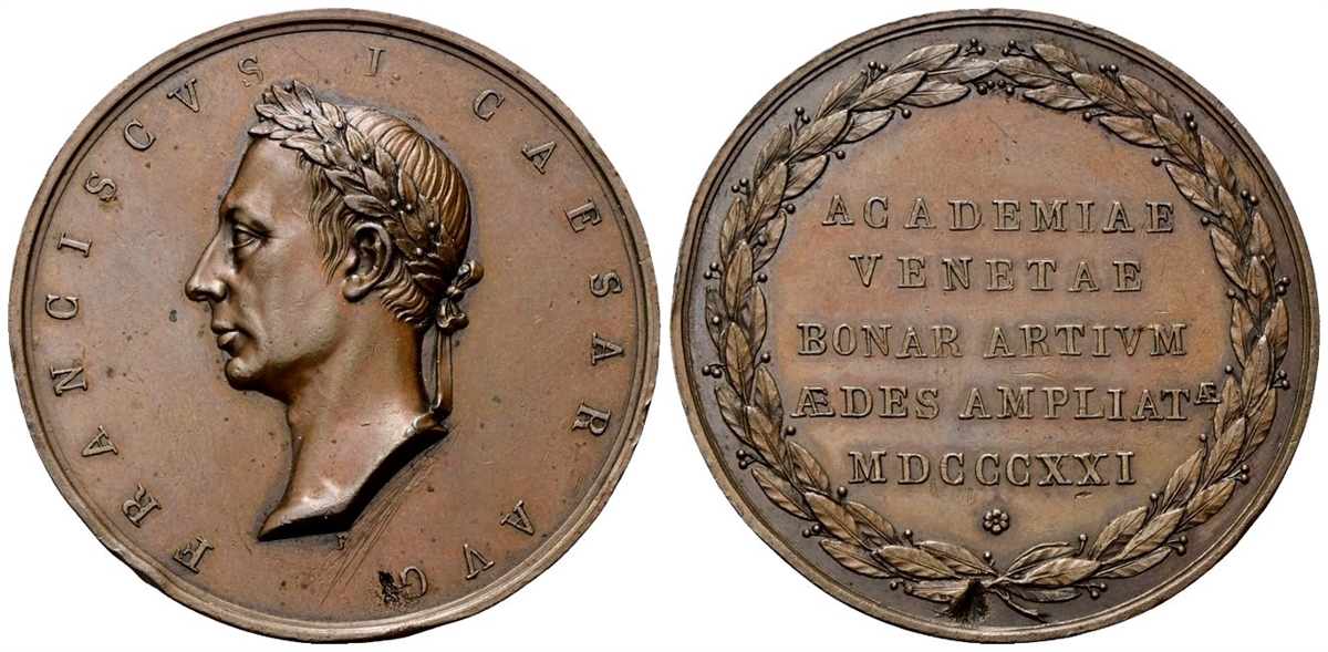Dr. FRANCISCVS I CAESAR AVG. Testa laureata a s.; sotto, F PUTINATI. Rv. ACADEMIAE / VENETAE / BONAR ARTIVM / AEDES AMPLIAT.AE / MDCCCXXI. Iscrizione disposta su cinque righe tra