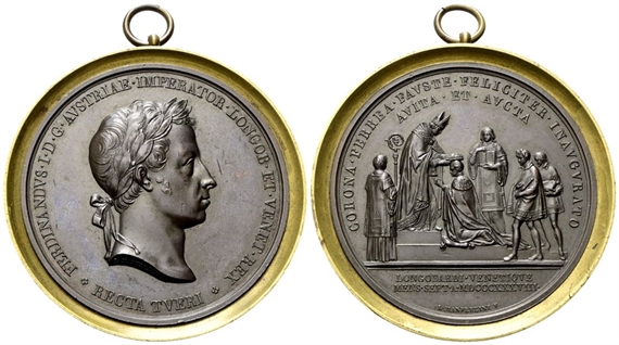 Dr. FERDINANDVS I D G AVSTRIAE IMPERATOR LONGOB ET VENET REX. Testa laureata a d.; sulla troncatura del collo, I MANFREDINI F; sotto, RECTA TVERI. Rv. CORONA FERREA FAVSTE FELICITER INAVGVRATO. L’Arcivescovo di Milano pone la corona ferrea sopra la testa di Ferdinando I; in esergo, LONGOBARDI VENETIQVE / MENS SEPT A MDCCCXXXVIII / L MANFREDINI F.