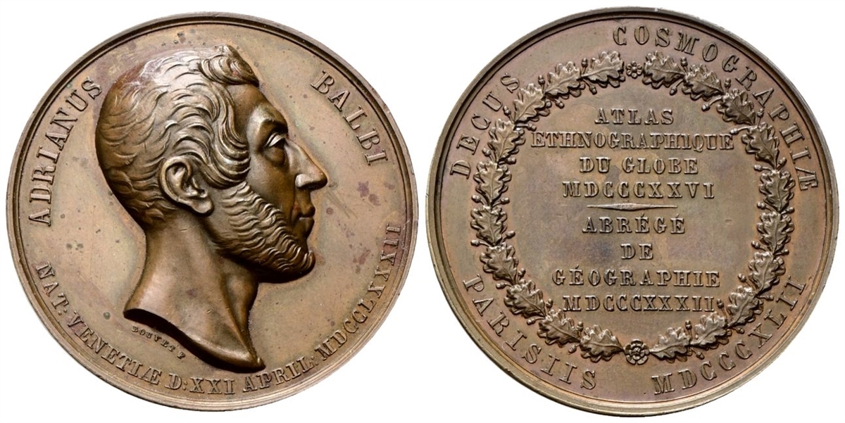 Dr. ADRIANUS - BALBI / NAT VENETIAE D XXI APRIL MDCCLXXXII. Testa nuda a s.; sotto, BOUVET F. Rv. DECUS COSMOGRAPHIAE / PARISIIS MDCCCXLII. ATLAS / ETNOGRAPHIQUE / DU GLOBE / MDCCCXXVI / ABRÉGÉ / DE / GÉOGRAPHIE / MDCCCXXXII. Iscrizione disposta su otto righe.