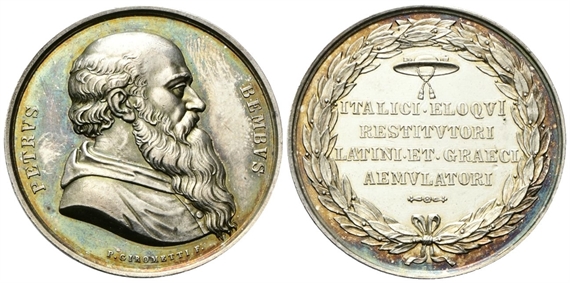 Dr. PETRVS - BEMBVS. Busto a d.; sotto, P GIROMETTI F. Rv. ITALICI ELOQVI / RESTITVTORI / LATINI ET GRAECI / AEMVLATORI. Iscrizione disposta su quattro righe sormontate da cappello cardinazio, tutto entro ghirlanda di foglie di lauro.