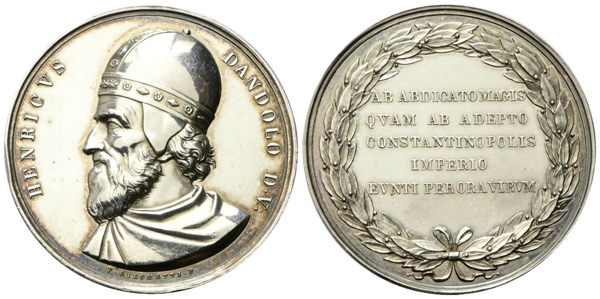Dr. HENRICVS - DANDOLO D V. Busto elmato a s.; sotto, P GIROMETTI F. Rv. IAB ABDICATO / MAGIS / QVAM / AB ADEPTO / COSTANTINOPOLIS IMPERIO / EVNTI PER ORA VIRVM. Iscrizione disposta su cinque righe, tutto entro ghirlanda di foglie di lauro.