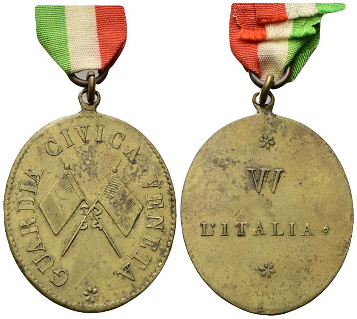 Governo Provvisorio di Venezia, 1848-1849. Medaglia-distintivo ovale 1848 con appiccagnolo in alto e in basso, per i componenti della Guardia Civica Veneta.