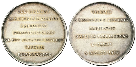 Dr. ALL’ITALIANO / AVV. DIONISIO ZANNINI / FERRARESE / FILANTROPO VERO / AL SUO CITTADINO NOVELLO / VENEZIA / RICONOSCENTE. Rv. VENEZIA / A LOMBARDIA E PIEMONTE / MOSTRATASI / SORELLA FIGLIA DEGNA / D’ITALIA / 5 LUGLIO 1848.