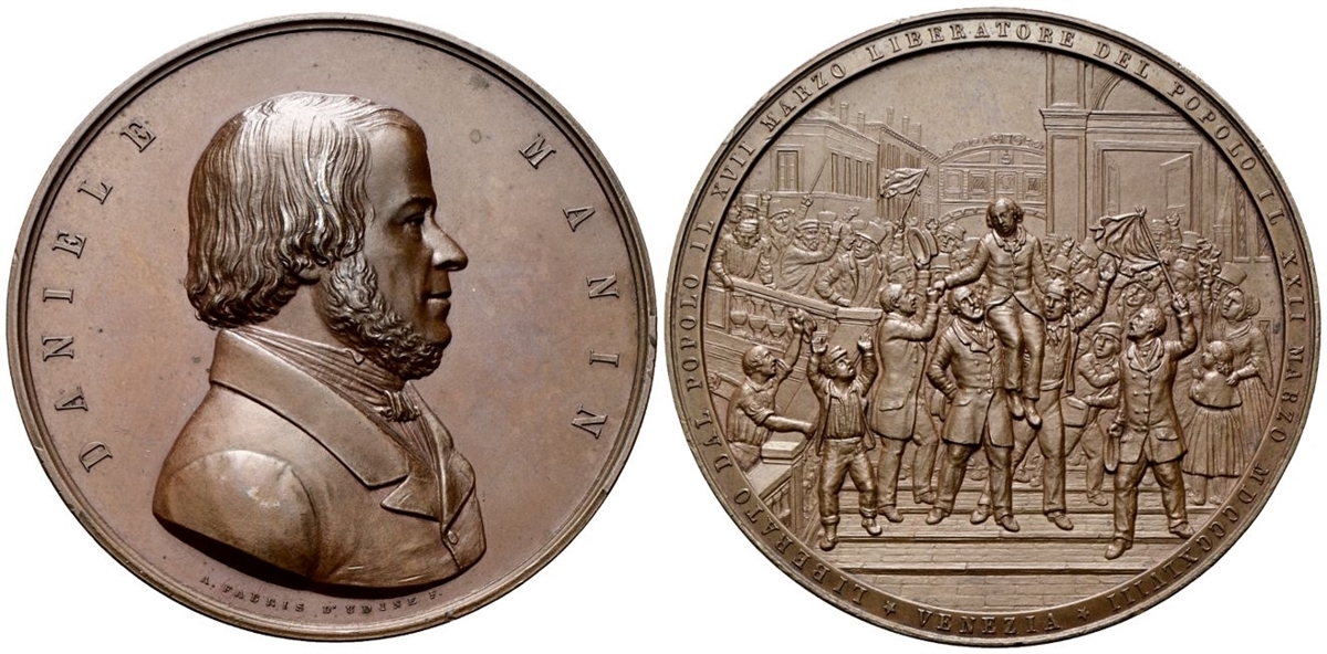 Dr. DANIELE - MANIN. Busto a d.; sotto la troncatura del busto, A FABRIS D’UDINE F. Rv. LIBERATO DAL POPOLO IL XVII MARZO XVII MARZO LIBERATORE DEL POPOLO IL XXII MARZO MDCCCXLVIII / VENEZIA. Manin portato in trionfo dal popolo.