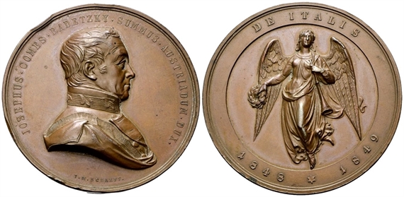 Dr. JOSEPHUS COMES RADETZKY SUMMUS AUSTRIADUM DUX. Busto corazzato a d.; sotto, I M SCHARFF. Rv. DE ITALIS / 1848 - 1849. Vittoria verso s., regge serto di alloro e tromba.