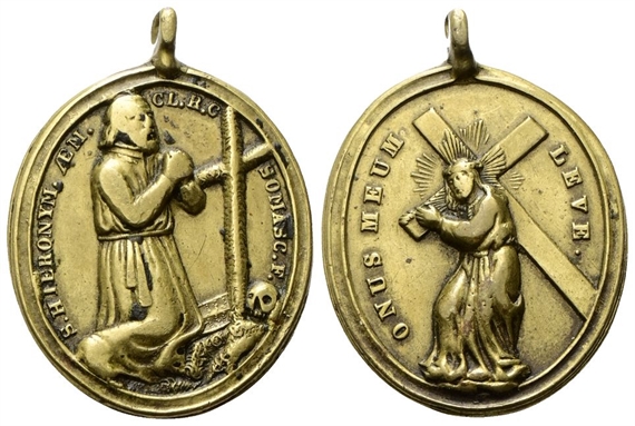 Dr. S HIERONYM AEM - CL R C - SOMASC F. San Gerolamo inginocchiato verso d., davanti alla Croce. Rv. ONUS MEUM - LEVE. Cristo regge la croce.