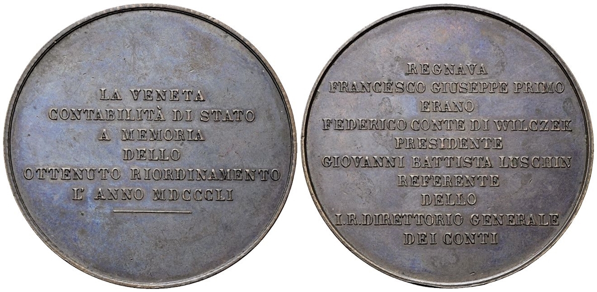 Dr. LA VENETA / CONTABILITÀ DI STATO / A MEMORIA / DELLO / OTTENUTO RIORDINAMENTO / L’ANNO MDCCCLI. Iscrizione disposta su sei righe. Rv. REGNAVA / FRANCESCO GIUSEPPE PRIMO / ERANO / FEDERICO CONTE DI WILCZEK / PRESIDENTE / GIOVANNI BATTISTA LUSCHIN / REFERENTE / DELLO / I. R DIRETTORIO GENERALE DEI CONTI. Iscrizione disposta su dieci righe.