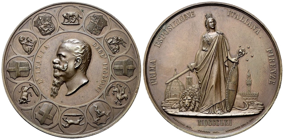 Dr. L’ITALIA DEGL’ ITALIANI. Testa nuda a s., tutto entro cornice formata dagli stemmi delle principali città italiane. Rv. PRIMA ESPOSIZIONE - ITALIANA FIRENZE. L'Italia turrita e stante regge spada e scudo; sullo sfondo, la cupola di Santa Maria in fiore e Palazzo Vecchio; in esergo, MDCCLXI; sotto, NICCOLINI INV FARNESI INC MATARELLI DIS E DIR.