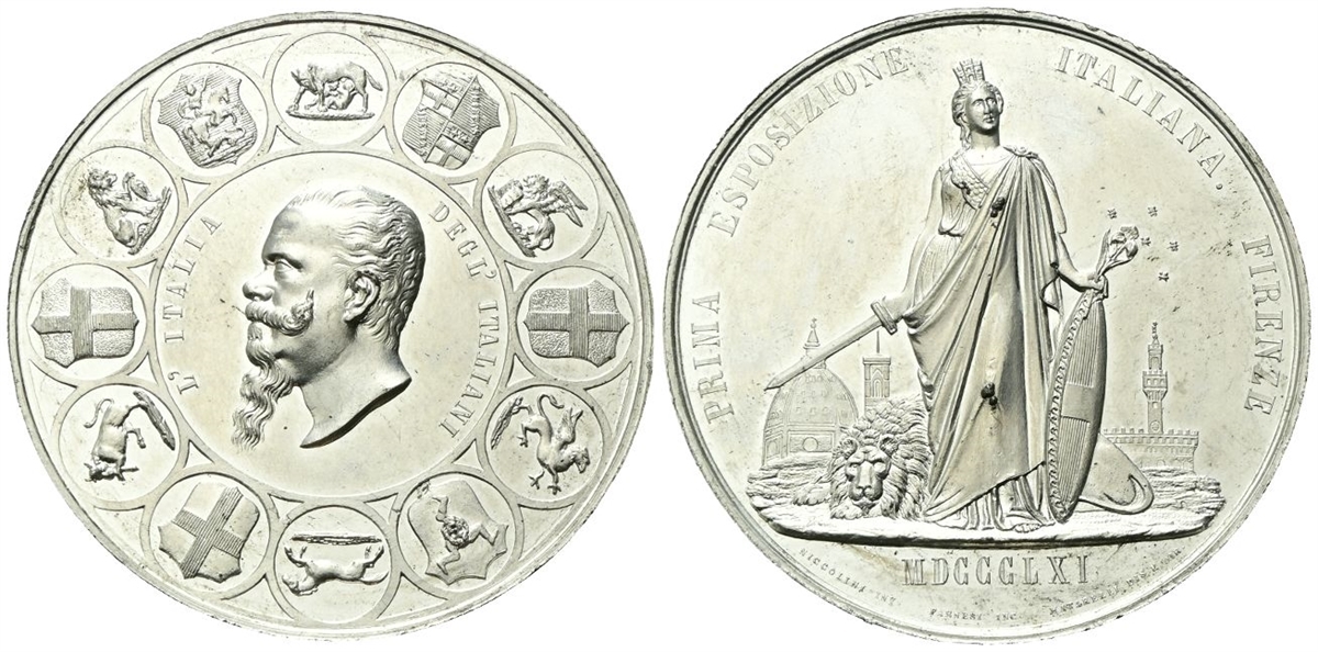 Dr. L’ITALIA DEGL’ ITALIANI. Testa nuda a s., tutto entro cornice formata dagli stemmi delle principali città italiane. Rv. PRIMA ESPOSIZIONE ITALIANA FIRENZE. L'Italia turrita e stante regge spada e scudo; sullo sfondo, la cupola di Santa Maria in fiore e Palazzo Vecchio; in esergo, MDCCLXI; sotto, NICCOLINI INV FARNESI INC MATARELLI DIS E DIR.