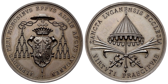 Dr. ALFREDVS PER MOROSINVS EPPVS ADMIN APCVS LVGANEN. Stemma sormontato da cappello cardinalizio. Rv. SANCTA LVGANENSIS ECCLESIA / VIRTVTI PRAECIPVAE. Padiglione sovrapposto a due rami di palma decussati.