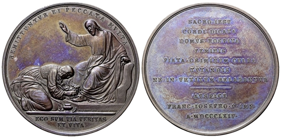 Dr. REMITTVNTVR EI PECCATA MVLTA. Gesù seduto benedice la Maddalena inginocchiata mentre lava i suoi piedi; a d., SEB SANTI DIP A FABRIS SCOLPI; in esergo, EGO SVM VIA VERITAS / ET VITA. Rv. SACRO IESV / CORDI DICATA / DOMVS HOSPITA / FEMINIS / PIATA