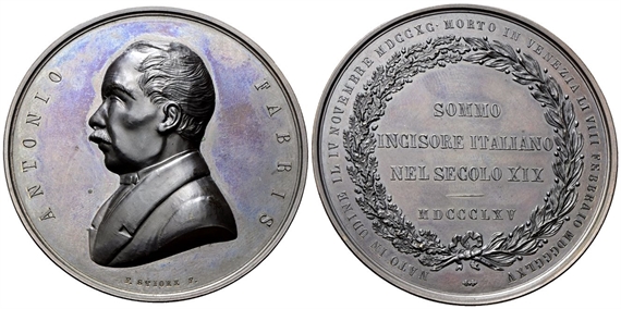 Dr. ANTONIO - FABRIS. Busto a d.; sotto, F STIORE F. Rv. NATO IN UDINE IL IV NOVEMBRE MDCCXC MORTO IN VENEZIA LI VIII FEBBRAIO MDCCCLXV. SOMMO / INCISORE ITALIANO / NEL SECOLO XIX / MDCCCLXV. Iscrizione disposta su quattro righe.
