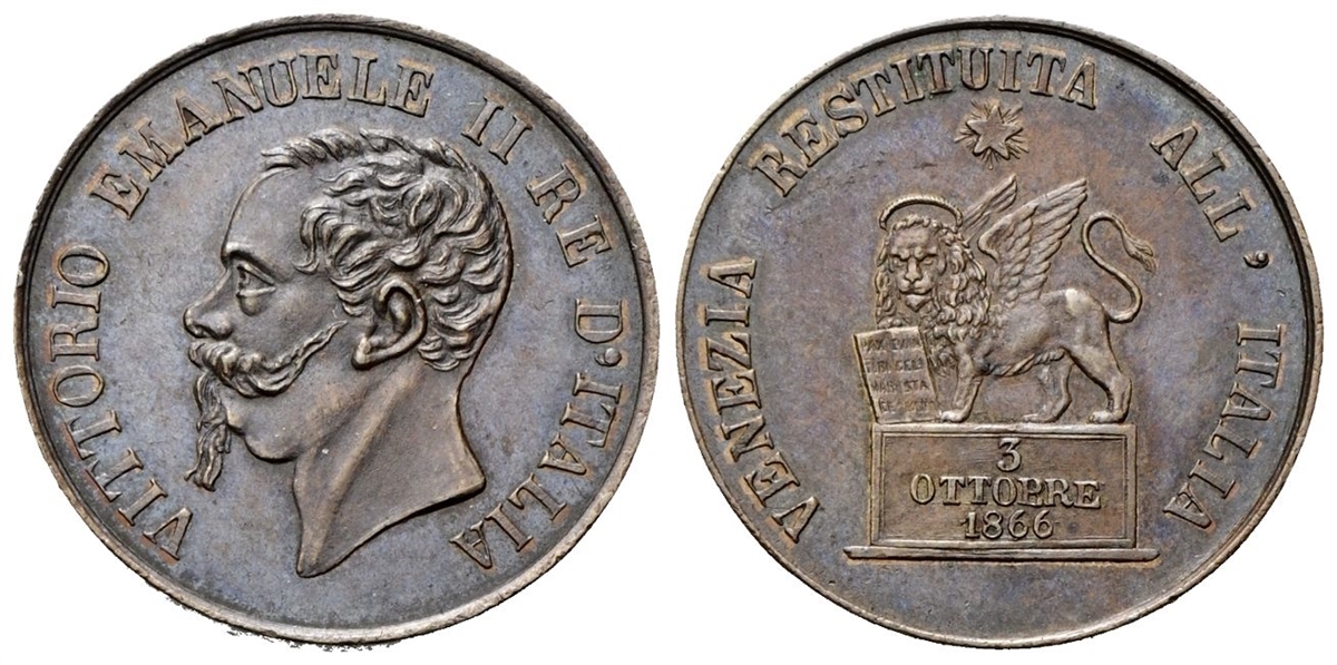Dr. VITTORIO EMANUELE II RE D’ITALIA. Testa nuda a s. Rv. VENEZIA RESTITUITA ALL’ITALIA. Leone di San Marco; sul piedistallo, 3 / OTTOBRE / 1866.