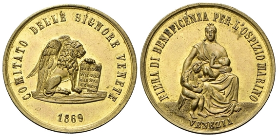 Dr. COMITATO DELLE SIGNORE VENETE 1869. Leone di San Marco con libro aperto e: scritta PAX / TIBI / MAR / CE / EVAN / GELI / STA / MEVS. Rv. FIERA DI BENEFICENZA PER L’OSPIZIO MARINO VENEZIA. La Carità allatta un bimbo e ne consola un altro, seduto al suo fianco; sotto, VENEZIA.