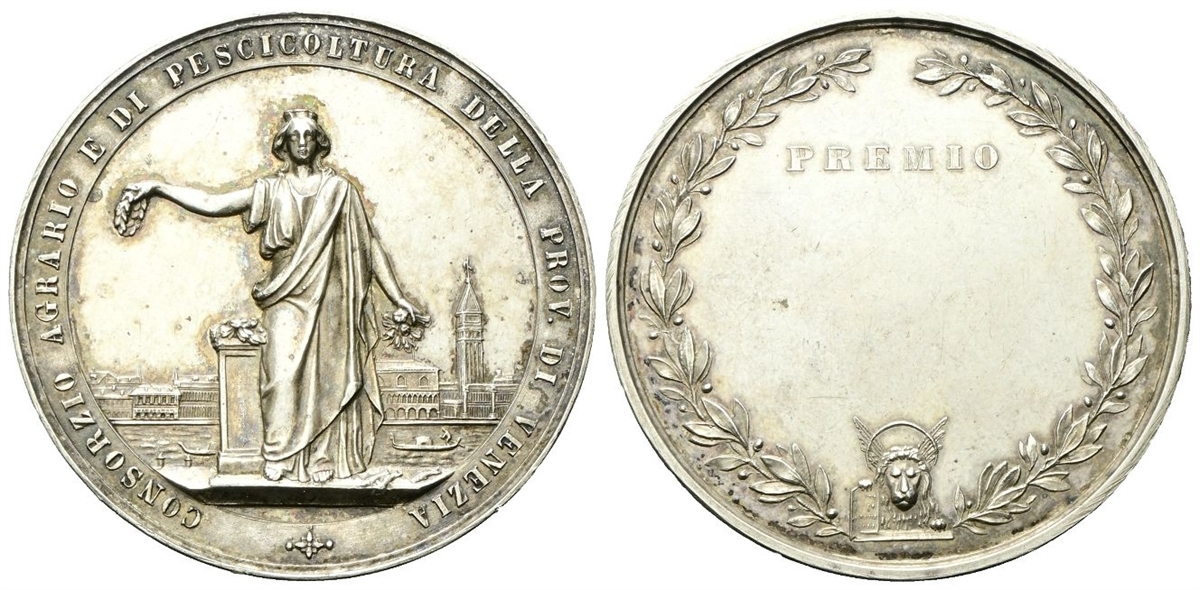 VENEZIA. Venezia, stante e frontale, reca nella mano d. una corona di alloro e nella s. dei fiori; dietro di lei, il Bacino di San Marco solcato da due gondole; sullo sfondo, i palazzi che sorgono su Rv. PREMIO. Corona formata da due rami di alloro legati tra loro in basso da un leone di San Marco in maestà.
