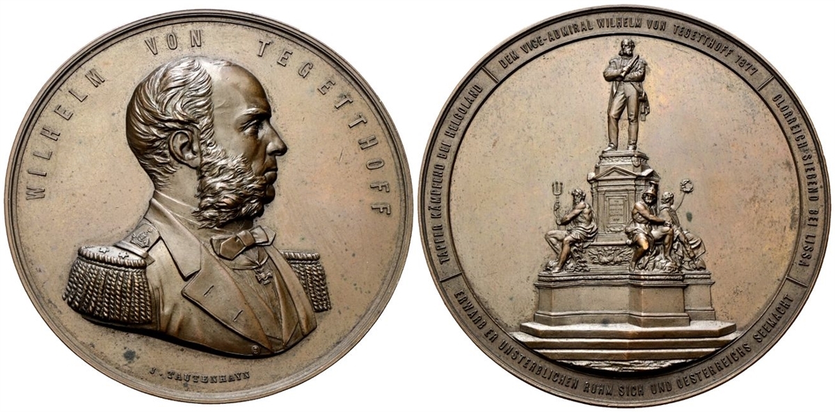 Dr. WILHELM VON TEGETTHOFF. Busto dell’ammiraglio a d., indossa uniforme; sotto, J TAUTENHAYN. Rv. TAPFER KÄMPFEND BEI HELGOLAND - DEM VICE AMIRAL WILHELM VON TEGETTHOFF 1877 - GLOREICH SIEGEND BEI LISSA - ERWARB ER UNSTERBLICHEN RUHM SICH UND OESTERREICHS SEEMACH. Monumento di Pola.