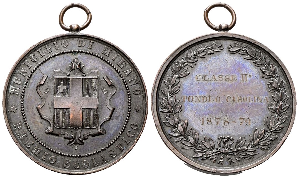 Dr. MUNICIPIO DI MIRANO / PREMIO SCOLASTICO. Stemma di Mirano entro una ricca cornice Rv. CLASSE IIA / TONOLO CAROLINA / 1878-79. Iscrizione (incisa) disposta su tre righe.