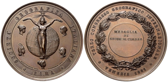 Dr. SOCIETA' GEOGRAFICA ITALIANA / ROMA. L’Italia ritta in piedi indossa con corona turrita sul capo; dietro, il globo terrestre; intorno, cinque teste femminili allusive di arie etnie esotiche; sotto, MONTEVERDE MOD - SPERANZA INC. Rv. RICORDO DEL III CONGRESSO GEOGRAFICO / VENEZIA 1881. MEDAGLIA / DI / SECONDA CLASSE. Iscrizione disposta su due righe.