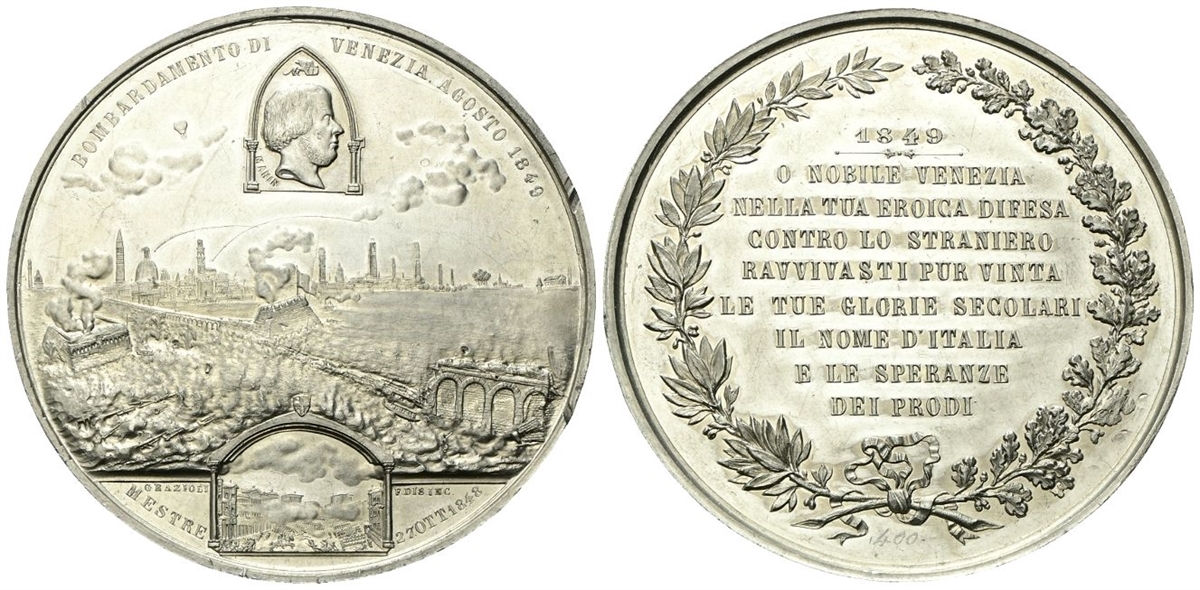 Dr. BOMBARDAMENTO DI - VENEZIA AGOSTO 1849. Profilo Di D. Manin entro edicola; sotto, il centro storico di Venezia, il ponte translagunare e i baluardi di San Giuliano bombardati; sotto, la sortita di Mestre; ai lati, MESTRE - 27 OTT 1848. Rv. 1849 / O NOBILE VENEZIA / NELLA TUA EROICA DIFESA / CONTRO LO STRANIERO / RAVVIVASTI PUR VINTA / LE TUE GLORIE SECOLARI / IL NOME D'ITALIA / E LE SPERANZE / DEI PRODI.