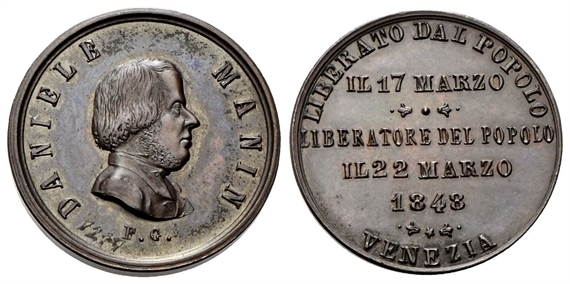 Dr. DANIELE - MANIN. Busto a d.; sotto la troncatura del busto, F G. Rv. LIBERATO DAL POPOLO. IL 17 MARZO / LIBERATORE DEL POPOLO / IL 22 MARZO 1848 / VENEZIA.