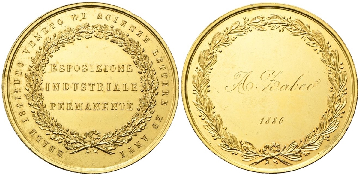 Dr. REALE ISTITUTO VENETO DI SCIENZE LETTERE ED ARTI. ESPOSIZIONE / INDUSTRIALE / PERMANENTE. Iscrizione disposta su tre righe entro entro corona formata da due rami di quercia legati in basso con un nastro. Rv. A ZABEO / 1886. Iscrizione incisa disposta su due righe tra due rami d’alloro legati in basso con un nastro