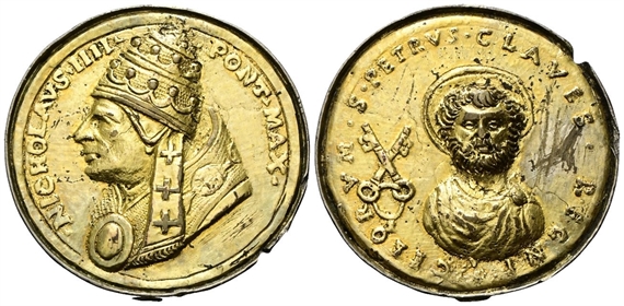 Dr. NICHOLAVS IIII - PONT MAX. Busto a s., con triregno e piviale decorato. Rv. S PETRVS CLAVES / REGNI CELORVM. Busto frontale; a s., chiavi decussate.