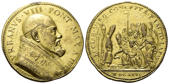 Dr. VRBANVS VIII PONT MAX A IIII. Busto a d., con camauro; sul taglio del busto, GASP; sotto, MOLO. Rv. ECCL B VIRG CONCEPTAE P IACTO LAPIDE. Il Pontefice assistito dai Cardinali pone la prima pietra della Chiesa di S. Maria della Concezione; in esergo, M DC XXVI.