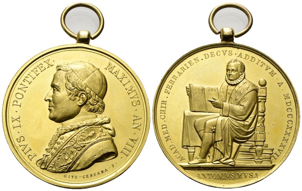 Dr. PIVS IX PONTIFEX - MAXIMVS AN VIII. Busto a s. con berretto e stola; GIVS CERBARA F. Rv. ACAD MED CHIR FERRARIEN DECVS ADDITVM A MDCCCXXXXVII. Antonio Musa seduto verso s., tiene un libro aperto e indica delle pagine iscritte HIP POC / APH; in esergo, ANTONIVS MVSA.