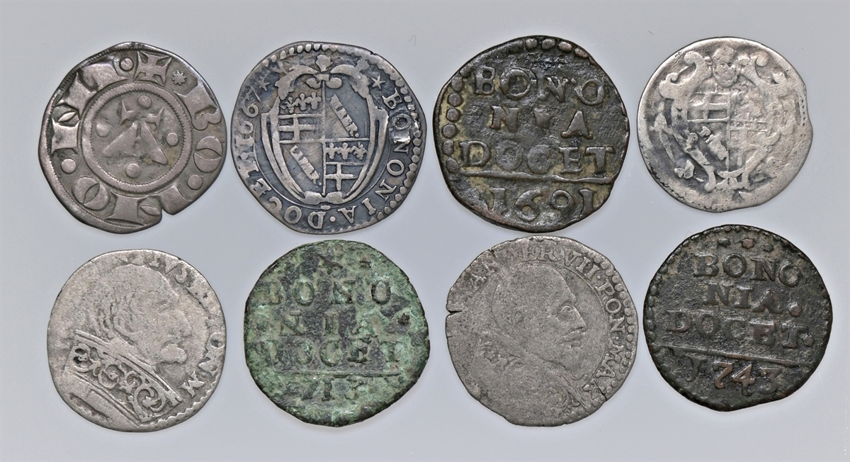 Lotto di 8 monete bolognesi per lo più papali (Alessandro VII,vInnocenzo XI, Clemente XI, Benedetto XIV) ad eccezione di un bolognino grosso a nome di Enrico VI.