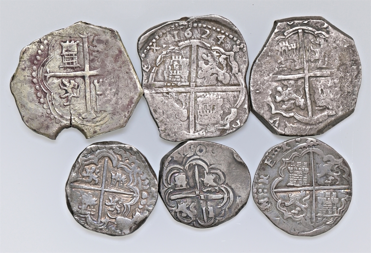 Lotto di 6 maltagliati spagnoli: si segnalano 4 reales 1624 con data perfettamente visibile, 2 reales di Città del Messico, 2 reales Pamplona...
